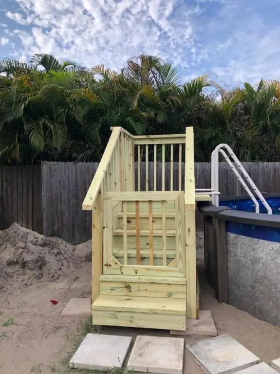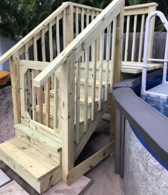 Pool steps 47x36 platform with steps and railing on both sides up to 54 inches tall, 4 inch overhang for over the edge of the pool. $899.00 delivered and set up.